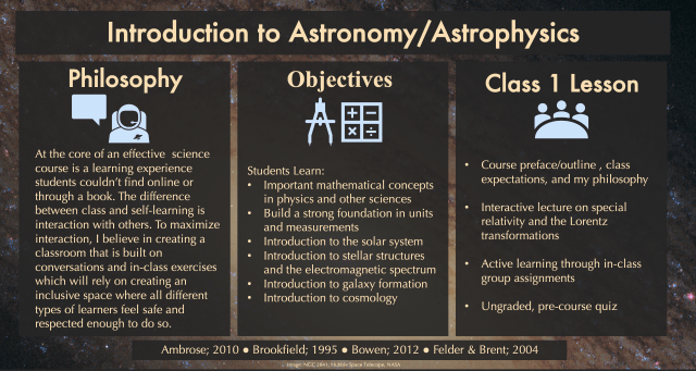 My teaching philosophy emphasizes different styles of learning and different life experiences that I encounter in my classroom. At the same time, this does not confiscate the rigor of the class. Students should leave my classroom having solidified their mathematical skills as well as developing a basic understanding of astronomy and astrophysics foundations. My overarching goal is to ensure that my course sets students up for success in their future classes/career/research, that they find the class useful (even if they decide astronomy is not for them), and that every student — especially those who have felt pushed away from science and the academia— gain confidence in their ability to learn challenging topics and be successful.
